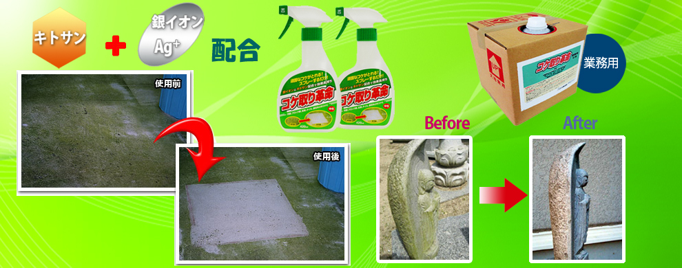 屋外の美観を損なわせるコケや水藻の除去に。キトサン&銀イオン配合で殺菌効果が長持ちするコケ取りスプレーです。塩素は使っていませんので安心です。公園やテーマパークの園内施設のコケ取りにも活躍しています。